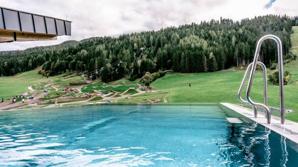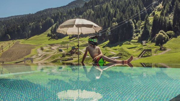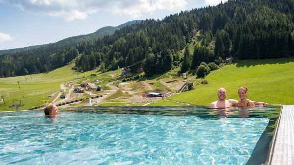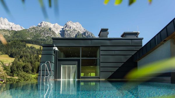 - Ganzjahres beheizter Infinity Pool auf dem Dach mit Blick auf den EPIC Bikepark Leogang sowie die Leoganger Steinberge.